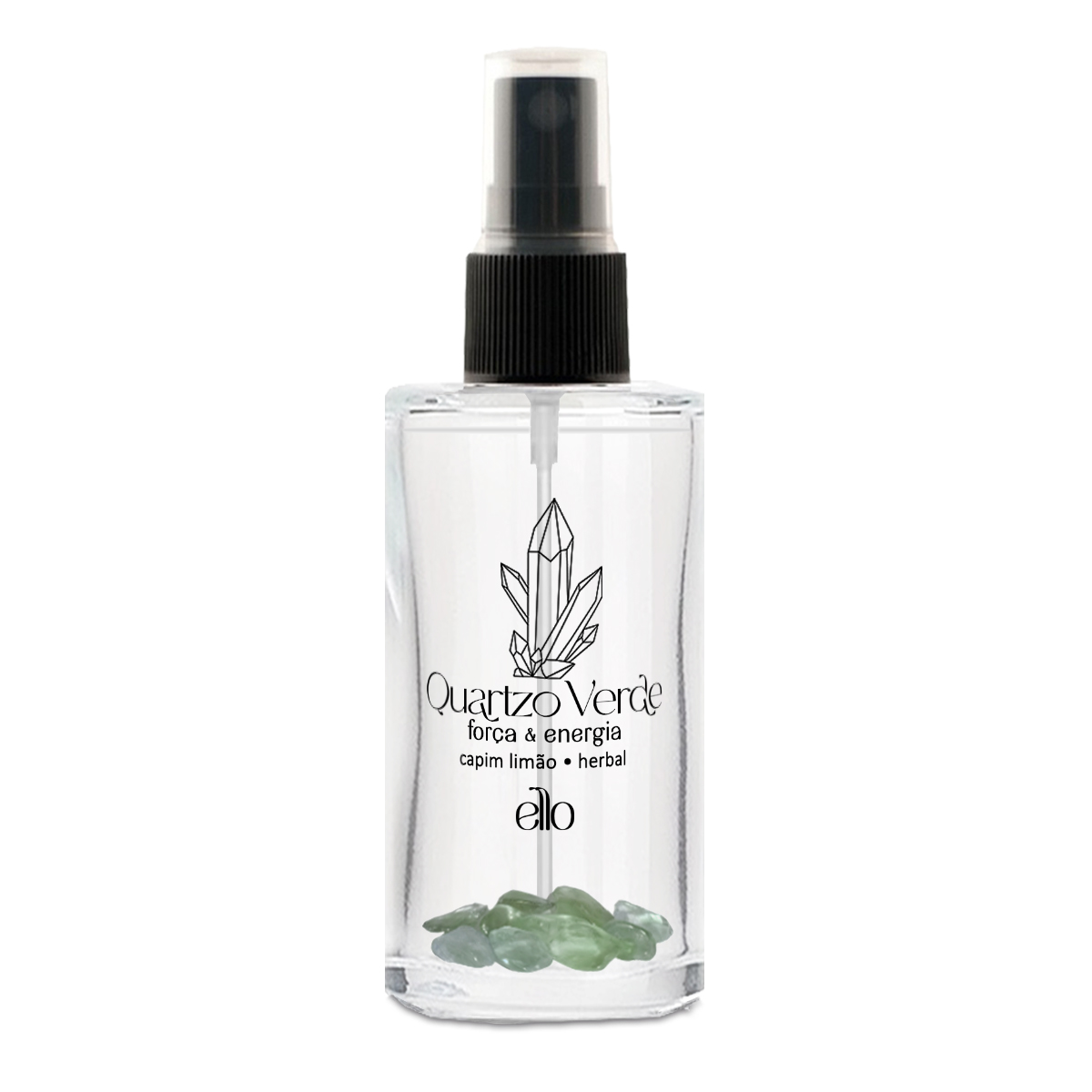 Spray Ambiental com aroma de Capim Limão. O cristal de Quartzo Verde traz forca e disposição para o corpo e a mente junto com o aroma de Capim Limão que promove uma sensação estimulante e revitalizante.